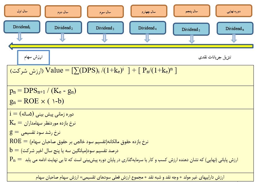 بر اساس این مدل، ارزش سهم عبارت از مجموع ارزش فعلی سودهای مورد انتظار نقدی است که در هر دوره به سهامداران پرداخت میگردد. در این مدل ارزش فعلی سود سهام پس از محاسبه سود هر سهم طی سنوات آتی، متناسب با میانگین درصد سود تقسیمی طی پنج سال گذشته و با استفاده از اطلاعات مالی ٥ سال آتی موضوع ماده ٥ این آییننامه، مبلغ سود تقسیمی هر سال محاسبه و سپس با تنزیل آنها بر اساس نرخ بازده مورد انتظار صاحبان سهام تا تاریخ تهیه گزارش ارزش سهام شرکت محاسبه میگردد. برای سالهای پس از آخرین دوره پیشبینی، سود نقدی دوره نهایی براساس فرمول رشد ثابت گوردون محاسبه میگردد.