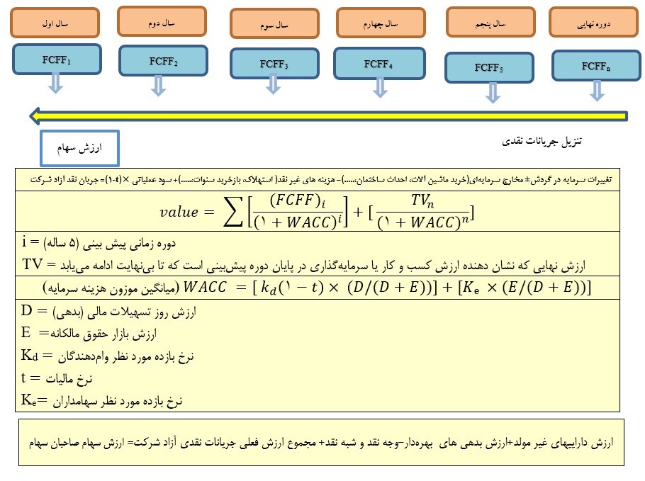 جریان نقد آزاد شرکت آن بخش از جریان نقدی عملیاتی است که قابل پرداخت به تأمین کنندگان سرمایه (سهامداران و اعتباردهندگان است)، بدون آنکه به توان تولیدی شرکت آسیب برسد یا فرصتهای سرمایهگذاری پیشروی مختل گردد. جریان نقد آزاد شرکت هر سال محاسبه و سپس با تنزیل آنها بر اساس میانگین موزون هزینه سرمایه ) WACC) تا تاریخ تهیه گزارش، ارزش سهام شرکت محاسبه میگردد. برای سالهای پس از آخرین دوره پیشبینی، جریان نقد آزاد شرکت دوره نهایی براساس فرمول رشد ثابت گوردون محاسبه میگردد.