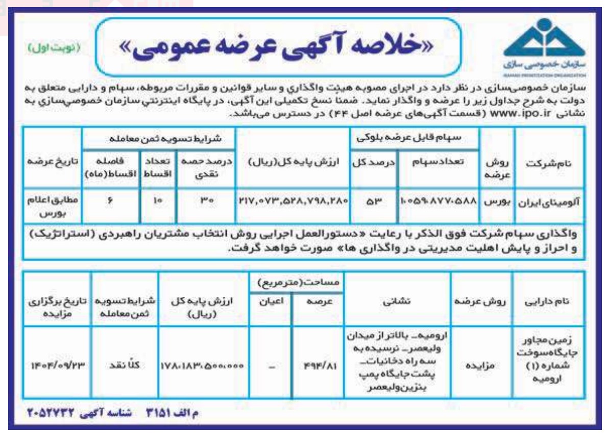 سازمان خصوصیسازی در نظر دارد در اجرای مصوبه هیأت واگذاری و سایر قوانین و مقررات مربوطه، شرکت آلومینای ایران و زمین مجاور جایگاه سوخت شماره (1) ارومیه را عرضه و واگذار نماید. نسخه تکمیلی این آگهی، در پایگاه اینترنتی سازمان خصوصیسازی (قسمت آگهیهای عرضه اصل 44) در دسترس میباشد.
