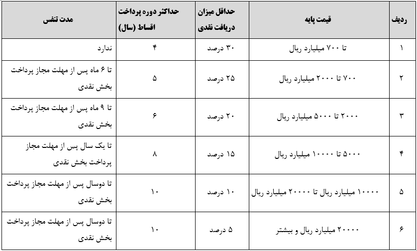 ماده ٤- موارد مربوط به فروشهای اقساطی شامل بخش نقدی، بخش اقساطی، برابر یا پلکانی بودن اقساط، حداکثر دوران پرداخت اقساط، تعداد اقساط، فاصله زمانی اقساط از یکدیگر، مدت تنفس برای شروع پرداخت اقساط (بدون احتساب سود فروش اقساطی) با رعایت جدول ذیل، با پیشنهاد سازمان خصوصیسازی و تصویب هیأت واگذاری تعیین و در آگهی عرضه به اطلاع عموم میرسد.